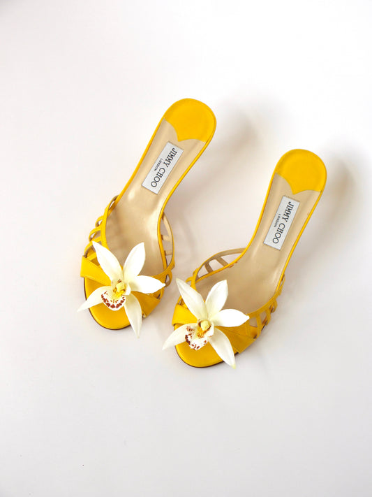 Reworked Upcycled Jimmy Choo Yellow Orchid Kitten Heels