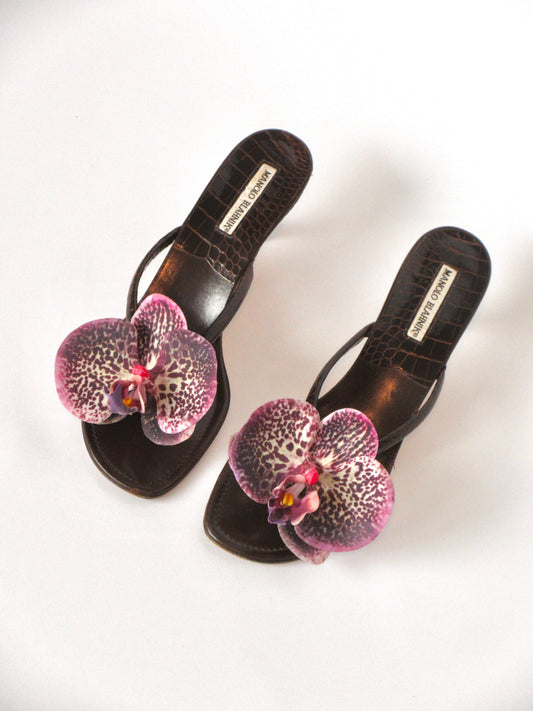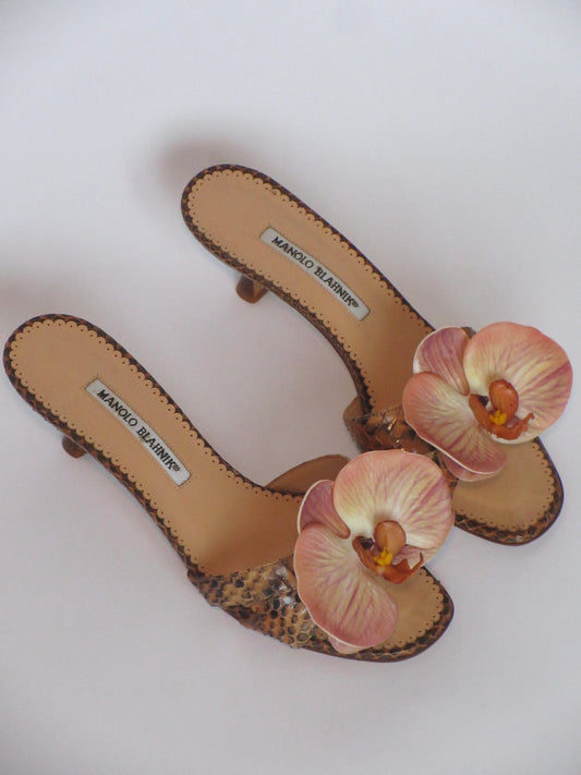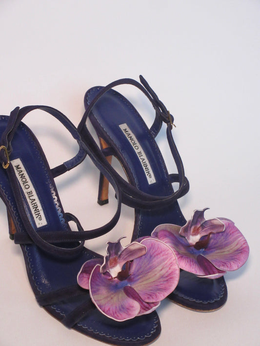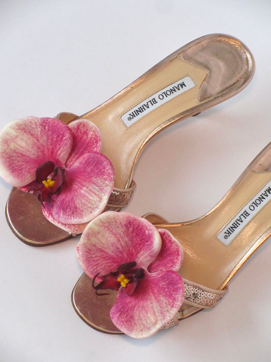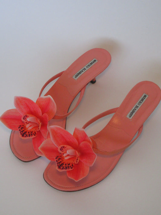 Reworked Upcycled Manolo Blahnik Coral Orchid Sandals