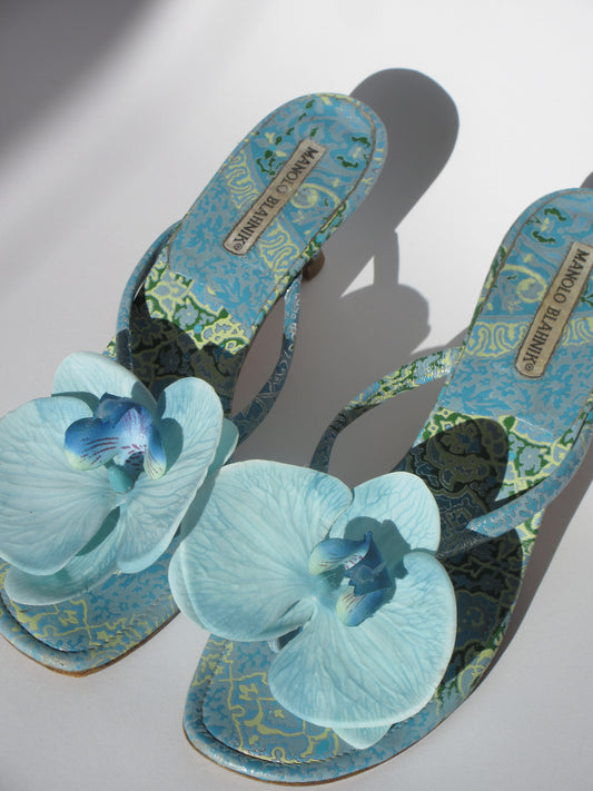 Reworked Upcycled Manolo Blahnik Light Blue Teal Orchid Kitten Heels